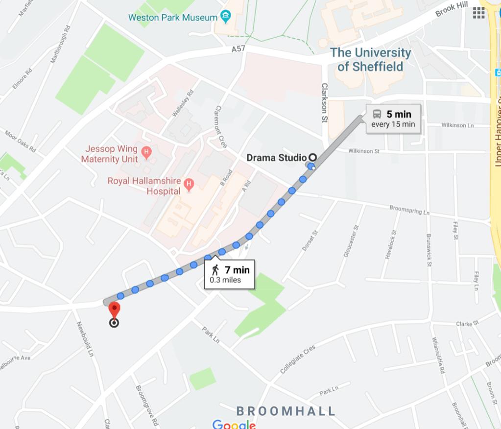 It is a 7min walk, 0.3 mile from the drama studio and there is plenty of parking for drop off and pick up! Best entry by car is directly off Glossop Road.